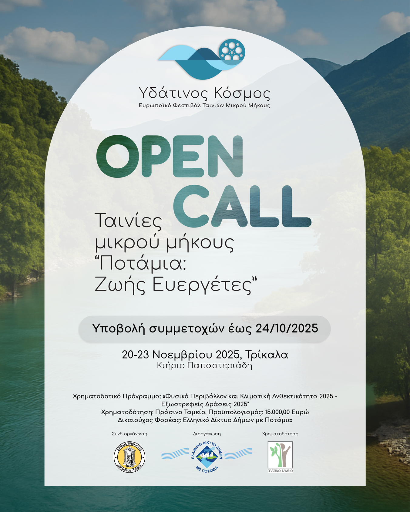 Το Ελληνικό Δίκτυο Δήμων με Ποτάμια, προσκαλεί δημιουργούς από όλη την Ελλάδα και την Ευρώπη να συμμετάσχουν στην ανοιχτή πρόσκληση (Open Call) για την υποβολή ταινιών μικρού μήκους στο Ευρωπαϊκό Φεστιβάλ Κινηματογράφου με θέμα:Υδάτινος Κόσμος’, «Ποτάμια: Ζωής Ευεργέτες». Μια πρωτοβουλία για την Περιβαλλοντική Προστασία, Ανάδειξη και Αξιοποίηση, Βιώσιμη Διαχείριση, των Ποτάμιων Οικοσυστημάτων, μέσω  της τέχνης του κινηματογράφου.