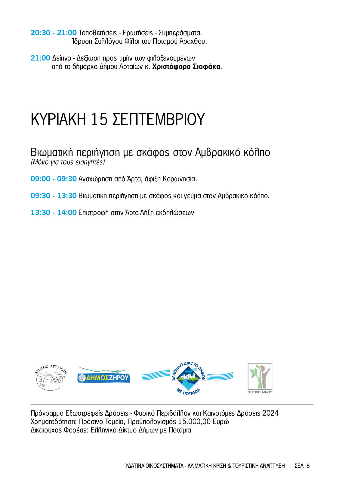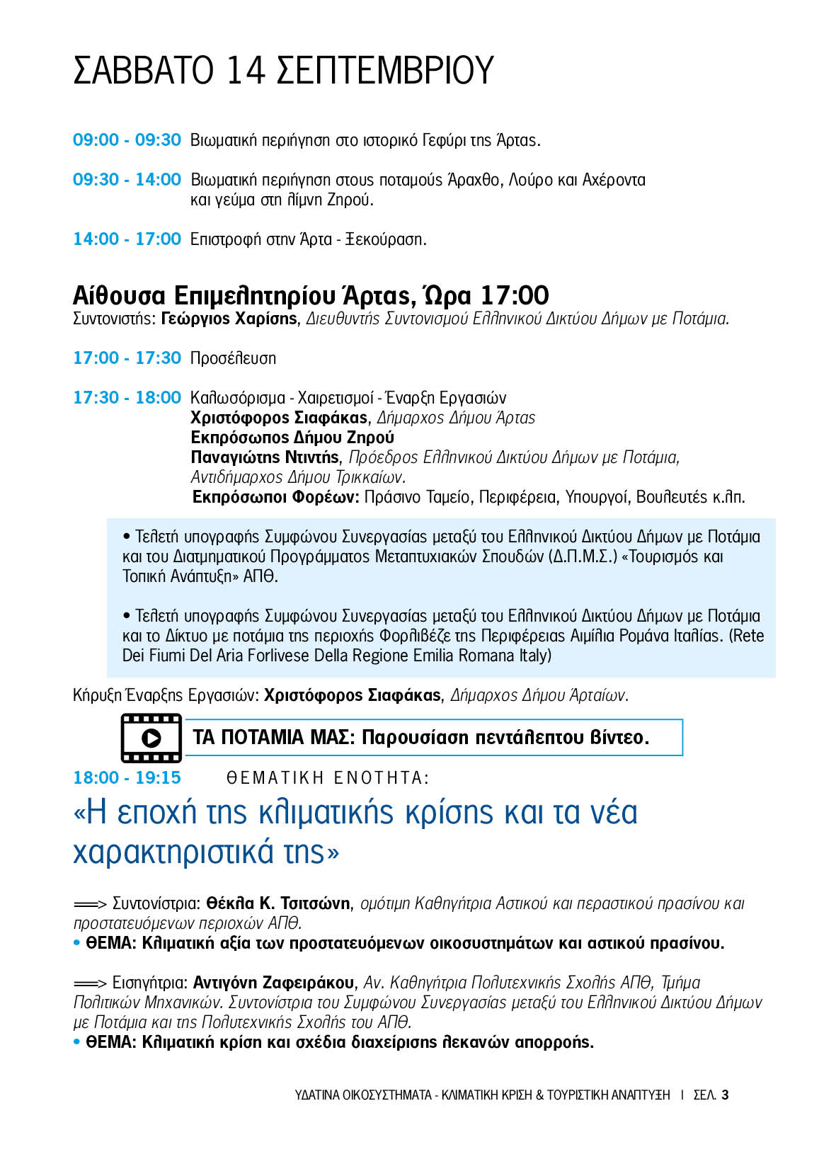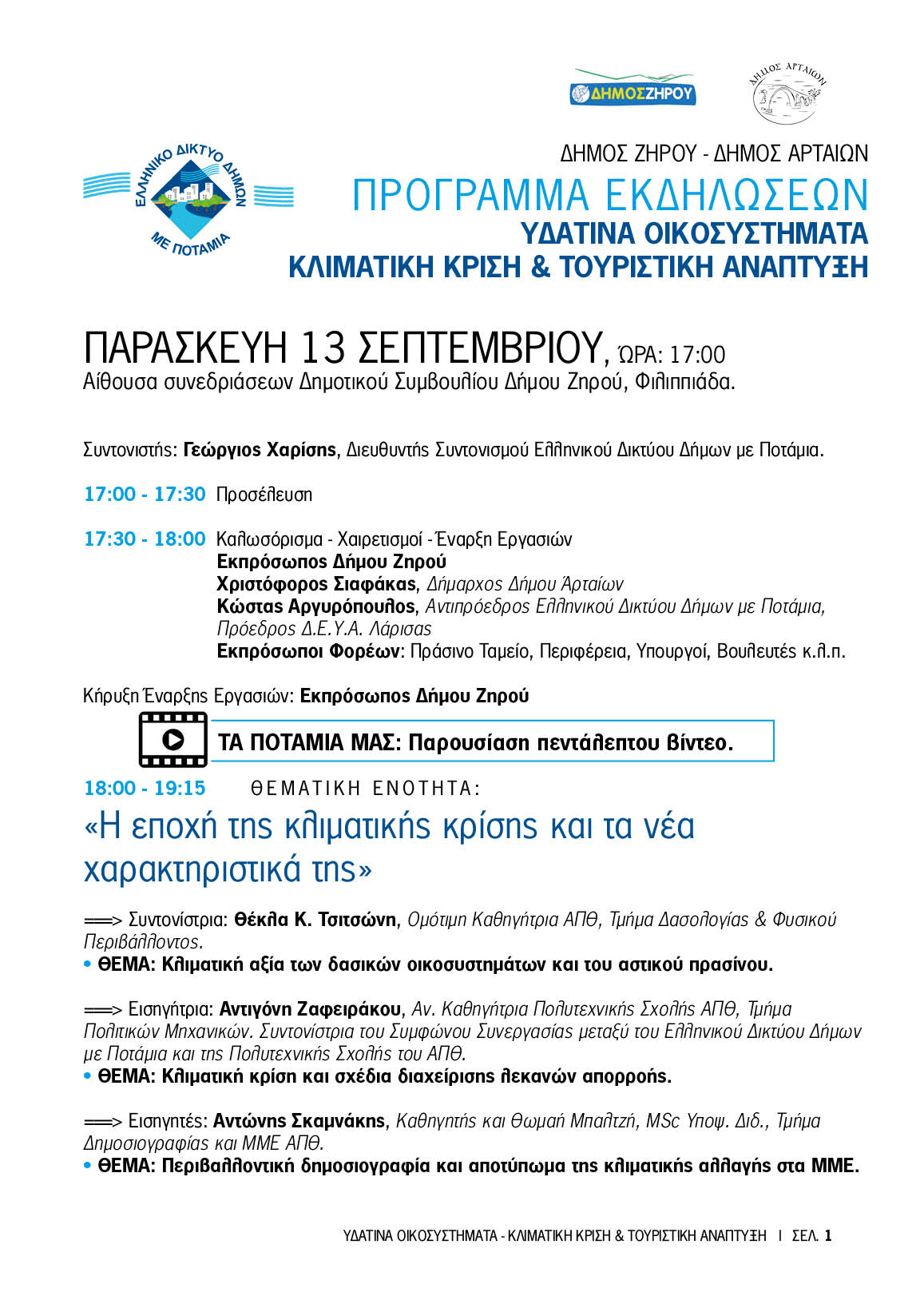 "Υδάτινα Οικοσυστήματα, Κλιματική Κρίση και Τουριστική Ανάπτυξη" είναι το θέμα των τριήμερων εκδηλώσεων που συνδιοργανώνεται από το Ελληνικό Δίκτυο Δήμων με Ποτάμια Δήμο, το Δήμο Αρταίων, το Δήμο Ζηρού και το Διατμηματικό Πρόγραμμα Μεταπτυχιακών Σπουδών  του ΑΠΘ << Τουρισμός και Τοπική Ανάπτυξη>>, την Παρασκευή 13 και το Σάββατο 14 και την Κυριακή 15 Σεπτεμβρίου 2024 στην πόλη της Άρτας και Φιλιππιάδα αντίστοιχα.