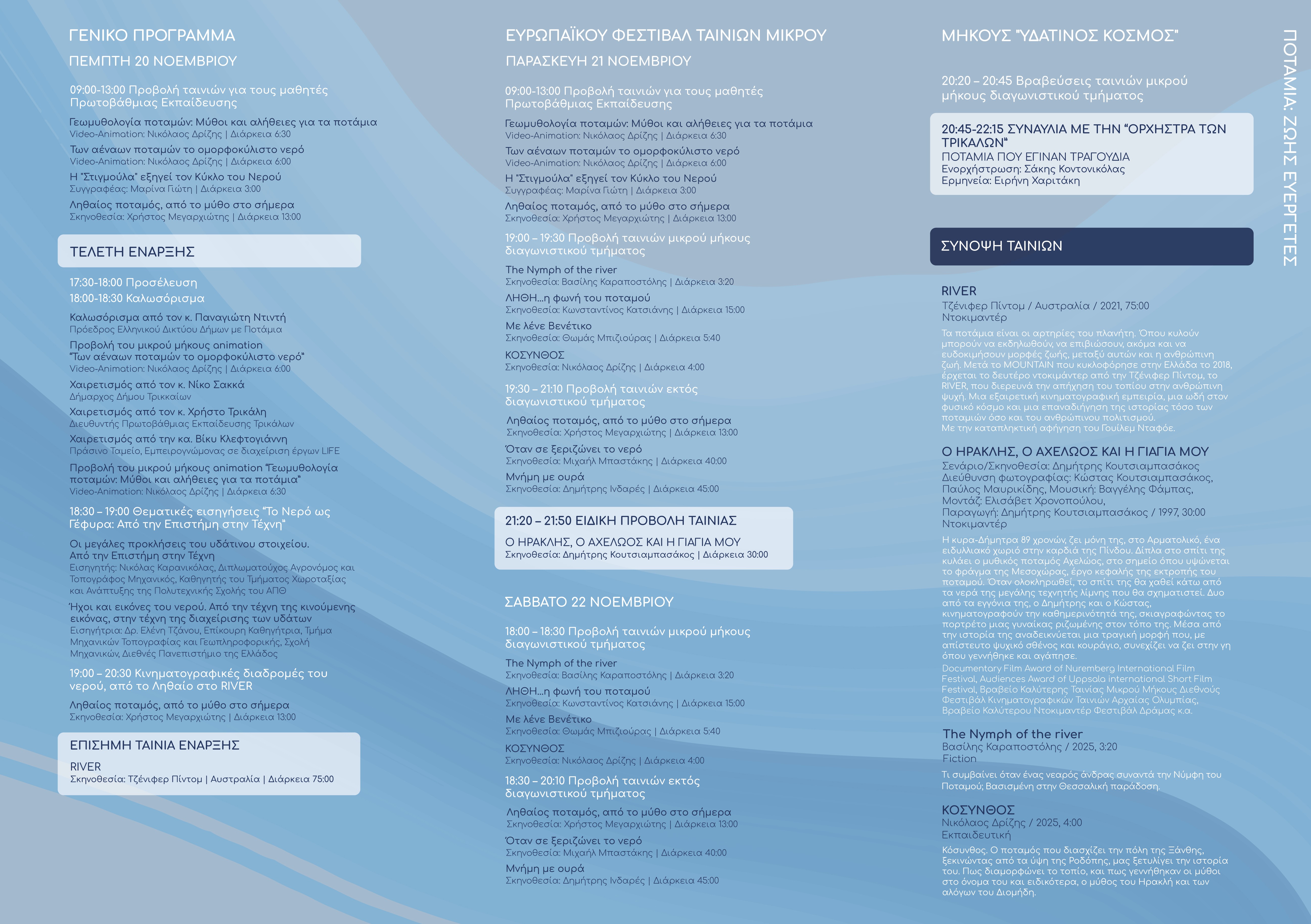 Η μέρα ξεκινά με πρωινές προβολές για μαθητές και συνεχίζεται με ταινίες που εντάσσονται εντός, αλλά και εκτός διαγωνιστικού τμήματος, οι οποίες εξερευνούν την οικολογία των ποταμιών, τη σχέση των ανθρώπων με τον τόπο της, τον μύθο και τη μνήμη του νερού, της σύγχρονες περιβαλλοντικές προκλήσεις.